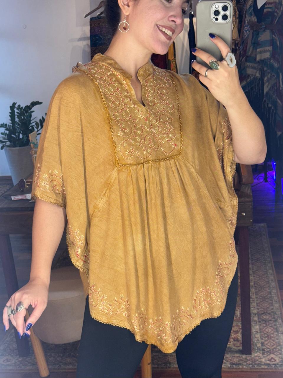 A bata Gipsy é perfeita para garantir conforto e elegância no dia a dia. O destaque fica por conta do bordado artesanal na gola, que adiciona um toque de identidade à peça. As mangas soltas proporcionam leveza e liberdade de movimento, tornando-a ideal para as composições boho-chic e looks autênticos.