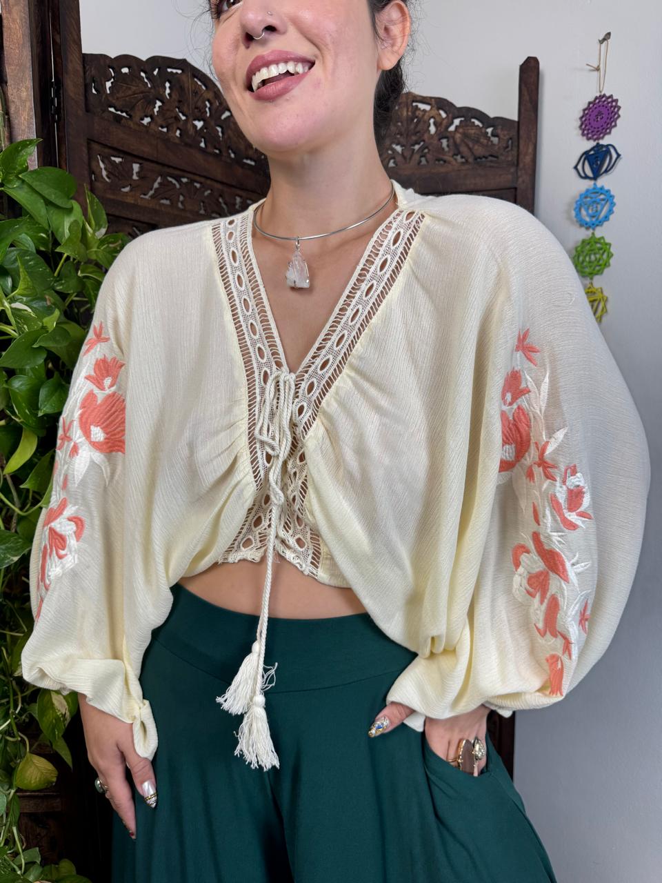 Moderna e cheia de charme, a Bata Harpia é a escolha ideal para quem busca um visual leve e marcante. Com modelagem ampla e confortável, ela se destaca pelos delicados bordados aplicados nas mangas, que trazem um toque artesanal e elegante à peça.
