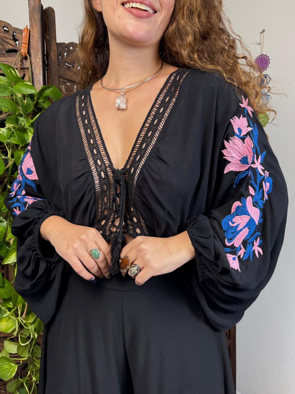 Moderna e cheia de charme, a Bata Harpia é a escolha ideal para quem busca um visual leve e marcante. Com modelagem ampla e confortável, ela se destaca pelos delicados bordados aplicados nas mangas, que trazem um toque artesanal e elegante à peça.