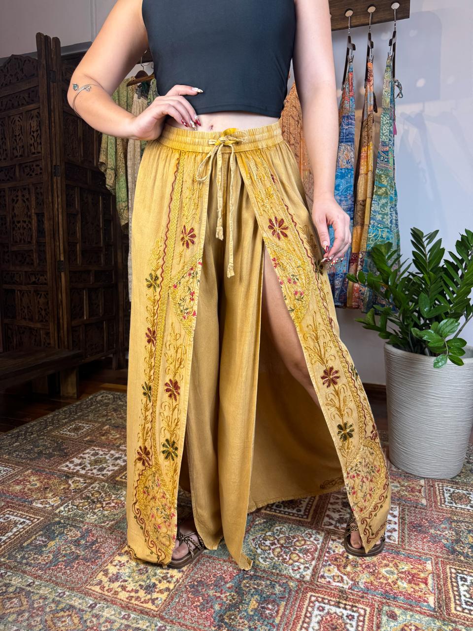 Cheia de personalidade a Calça Ísis une conforto e estilo de forma única. Confeccionada com tecido leve, ela apresenta bordados artesanais que enriquecem a calça com detalhes culturais e autênticos. As fendas laterais trazem movimento e sensualidade na medida certa. Ideal para compor seus looks boho.