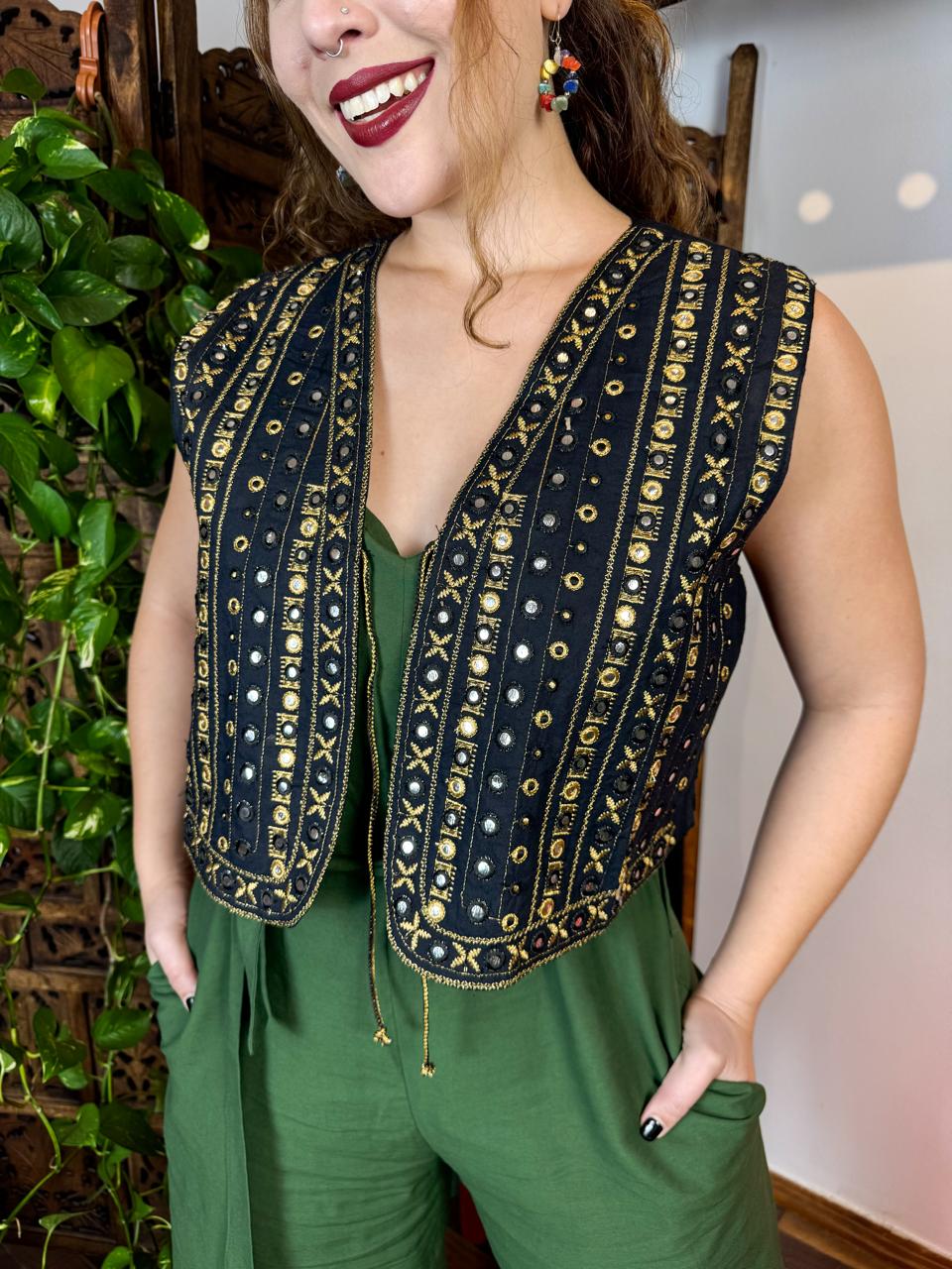 Colete tamanho único em cor neutra, com bordados artesanais e micro espelhos que trazem brilho sutil. Versátil e elegante, é ideal para sobrepor looks com estilo e personalidade.