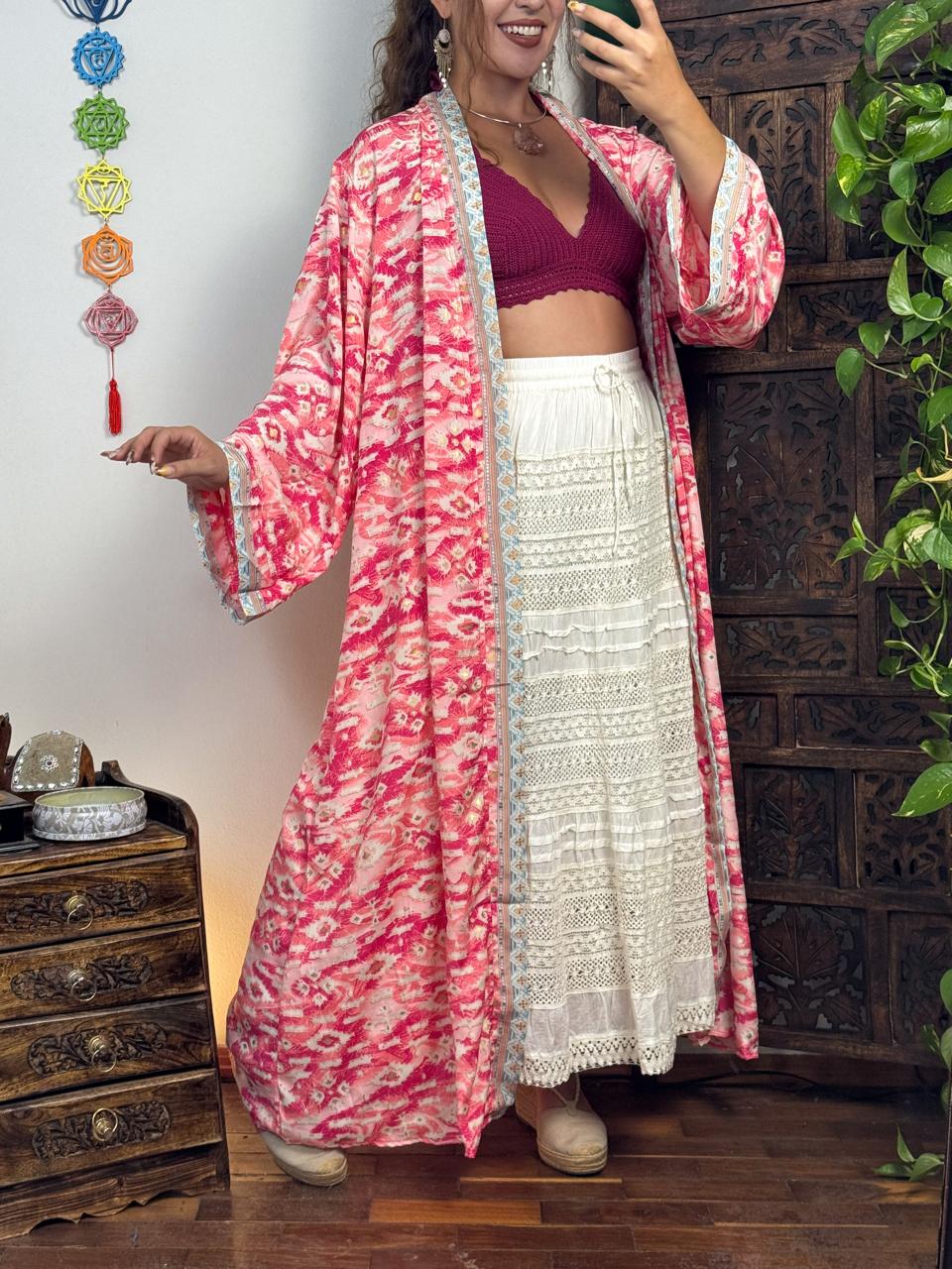 Com caimento leve e toque suave sobre a pele, o Kimono Bohemian traz elegância e sofisticação com suas estampas e cores vibrantes típicas da Índia. Acompanha uma faixa no mesmo tecido para amarração na cintura permitindo ajuste personalizado e podendo ser usado também como vestido. Ideal para sobrepor looks com charme e estilo, com um toque refinado.
