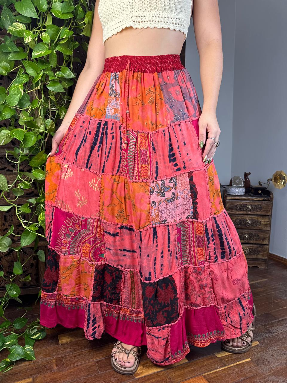 Nossa saia Woodstock é confeccionada em retalhos de viscose unindo diferentes cores e estampas em uma composição vibrante e cheia de personalidade. Cada peça é única, com um mix artesanal que valoriza o reaproveitamento criativo de materiais. Perfeita para quem ama um estilo boho, livre e consciente.