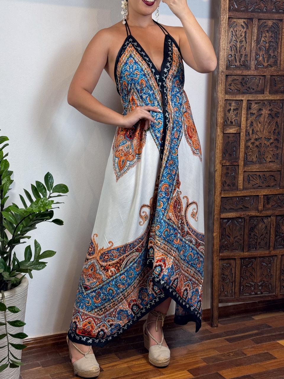 Leve, vibrante e com caimento impecável. A escolha certa para quem busca estilo com conforto. Confeccionado em viscose de alta qualidade, ele traz uma estampa colorida marcante e exclusiva, perfeita para iluminar qualquer ocasião. Possui amarração ajustável que valoriza o busto e permite um caimento personalizado. Uma peça versátil, fresca e cheia de personalidade.
