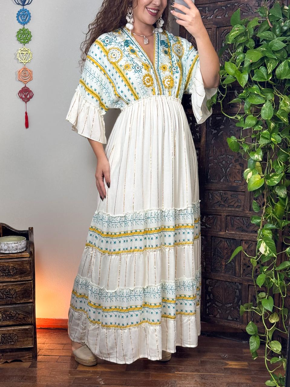 O Vestido Amy traduz liberdade e sofisticação artesanal em cada detalhe. Confeccionado em tecido leve e fluido, ele apresenta aplicações que enriquecem a peça com textura e personalidade, criando um visual único e cheio de autenticidade.