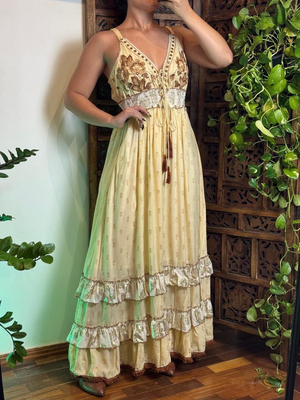 O Vestido Asha é a união perfeita entre leveza e sofisticação artesanal. Confeccionado em tecido fluido que acompanha cada movimento, ele traz uma aura mística e espontânea, típica do espírito boho. As pedrarias aplicadas à mão iluminam o look com um brilho sutil — detalhes que transformam a peça em algo único e cheio de personalidade.