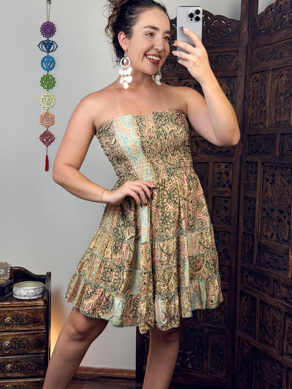 Encante-se com o charme do vestido Lótus! Toque macio da seda indiana e ajuste perfeito, ele valoriza o corpo com conforto e sofisticação. Perfeito para quem ama um visual autêntico e romântico.