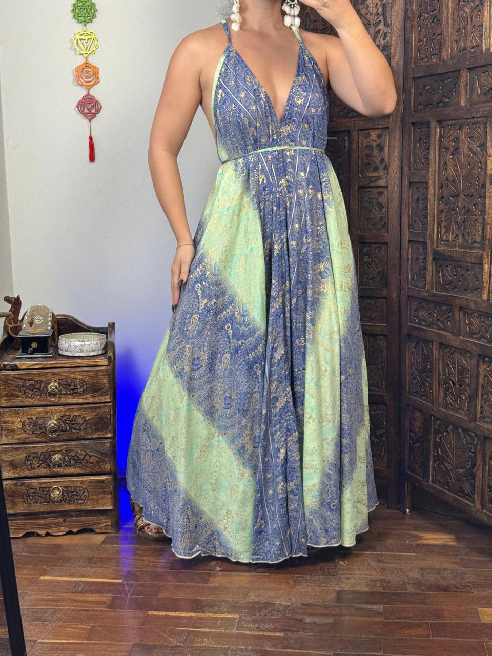 Fora do convencional, o Vestido Indiano Magnólia traz seu charme em recortes acinturados, com amplitude e estampas ricas. Pra quem ama surpreender, nosso vestido Mag também pode ser usado como frente única montando um look poderoso sem esforço.