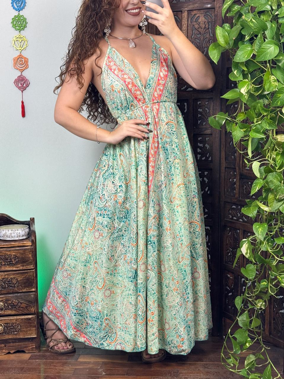 Fora do convencional, o Vestido Indiano Magnólia traz seu charme em recortes acinturados, com amplitude e estampas ricas. Pra quem ama surpreender, nosso vestido Mag também pode ser usado como frente única montando um look poderoso sem esforço.